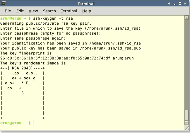 在运行完以上命令了以后,我们需要回答一系列的问题。首先选择保存密钥的路径,按回车将会选择默认路径即家目录的一个隐藏的.ssh文件夹。下一个提示是请输入口令提醒。我个人将此留空(直接回车)。之后密钥对就会创建,大功告成。