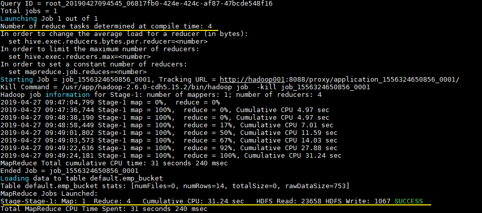 可以从执行日志看到CTAS触发MapReduce操作,且Reducer数量和建表时候指定bucket数量一致: